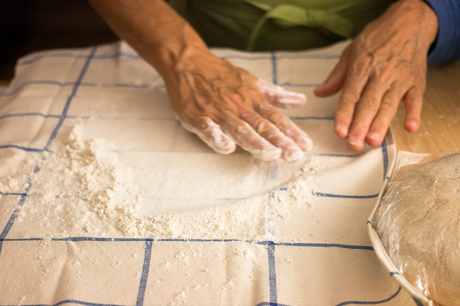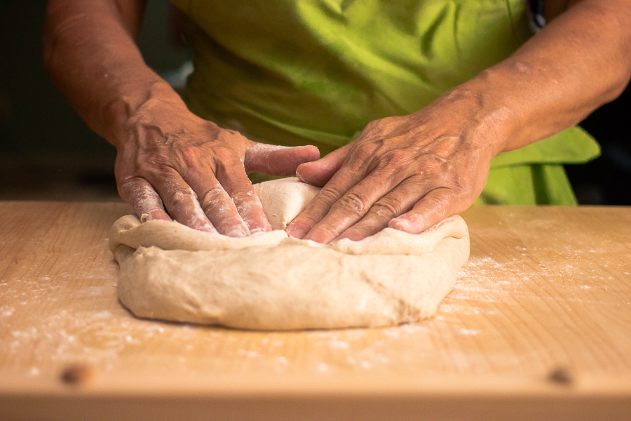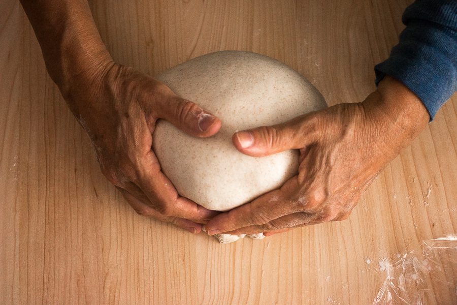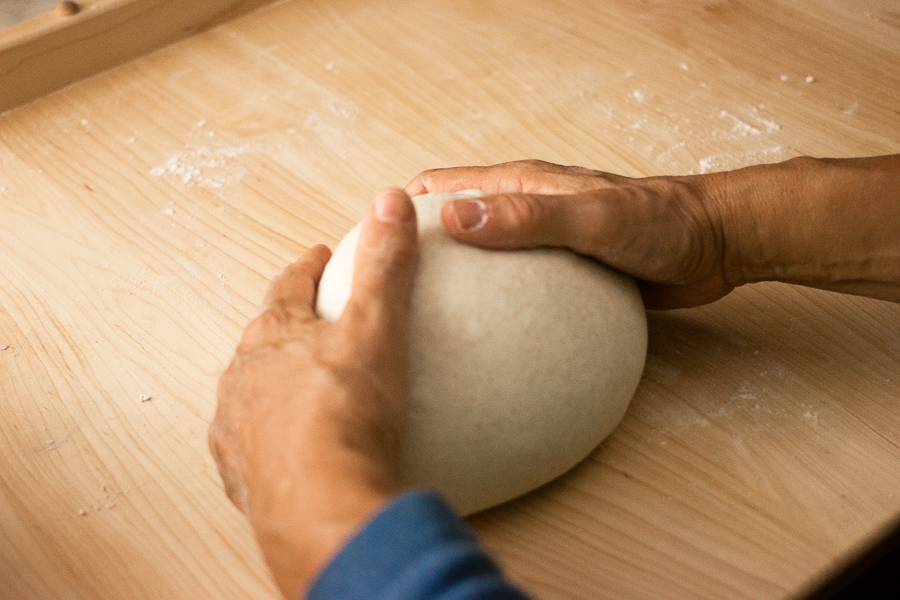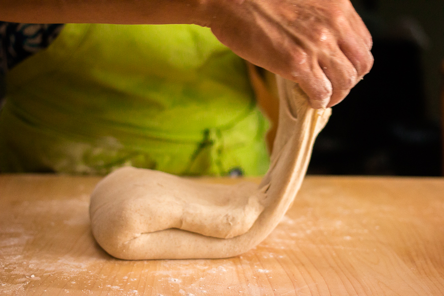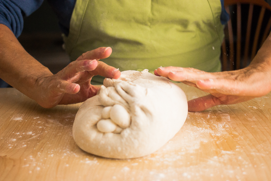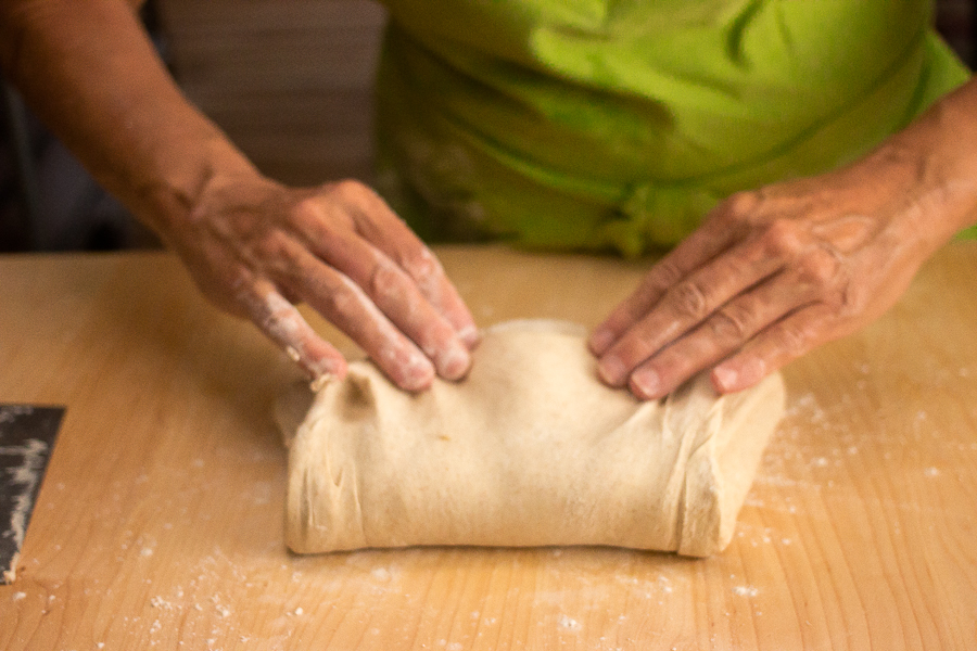 You can either flour or wet your hands before touching the dough to prevent sticking. Grab the dough with the fingers and thumb of both hands and pull one “corner” about two-thirds of the way across the dough and then press down to release some of the built-up gas.