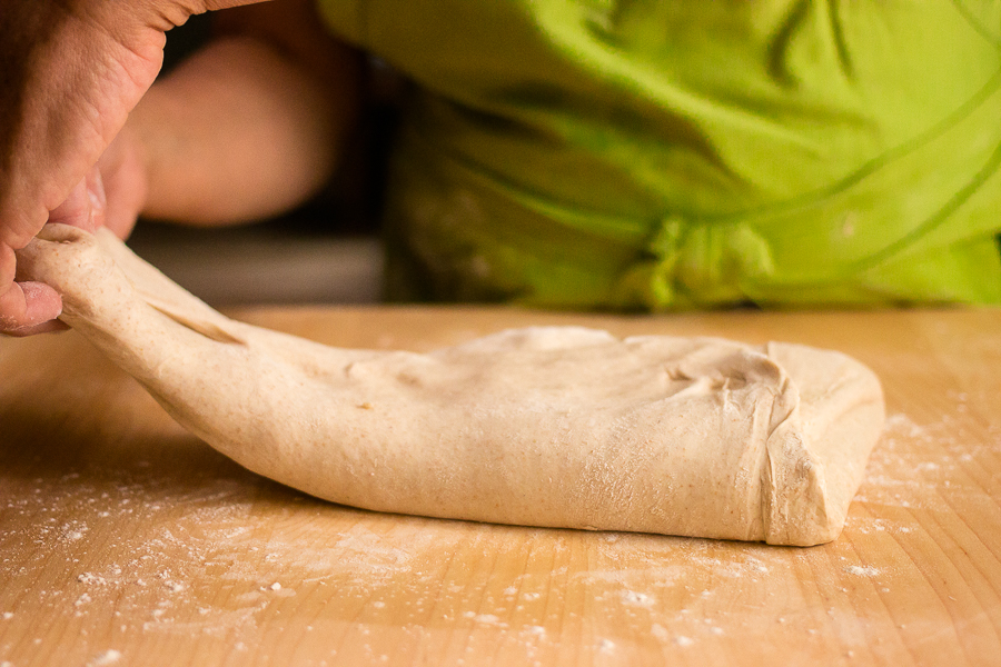 Tearing that occurs during shaping will continue through the baked loaf, so it’s important to maintain a smooth surface. A little flour on your hands is helpful; but too much flour on the table may make it hard to seal the bottom of your loaf, so keep a clean spot for this purpose.