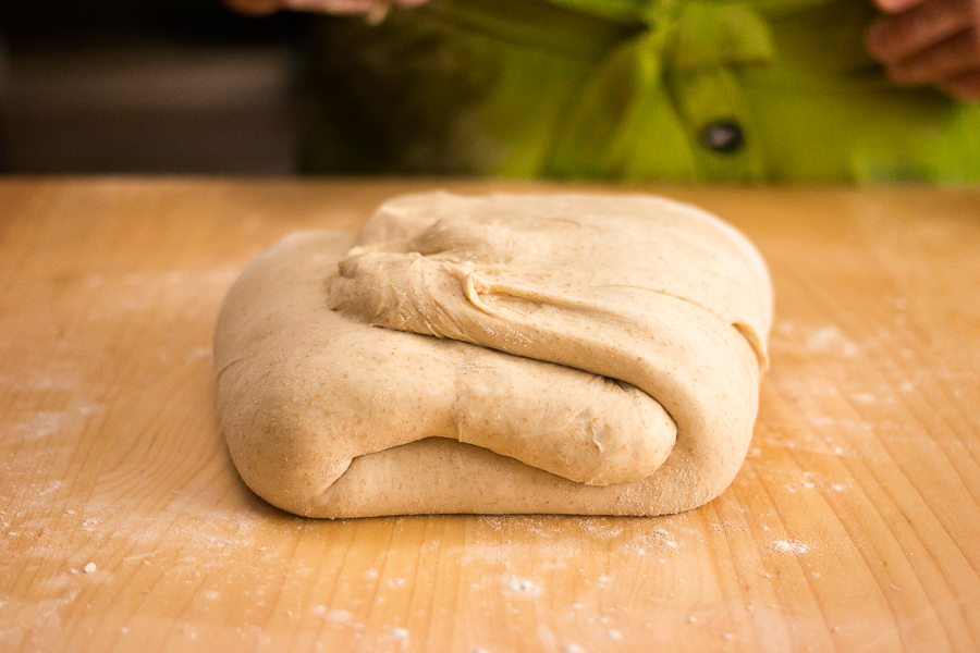 Folding is just that – a series of stretch and folds that go from the four imaginary corners of your blob of dough towards the center, opposite sides folding over each other to form a neat little package by the end of the folding process. This brief exercise contributes a great deal of strength to your dough, and is especially helpful in developing the structure of a wet dough.