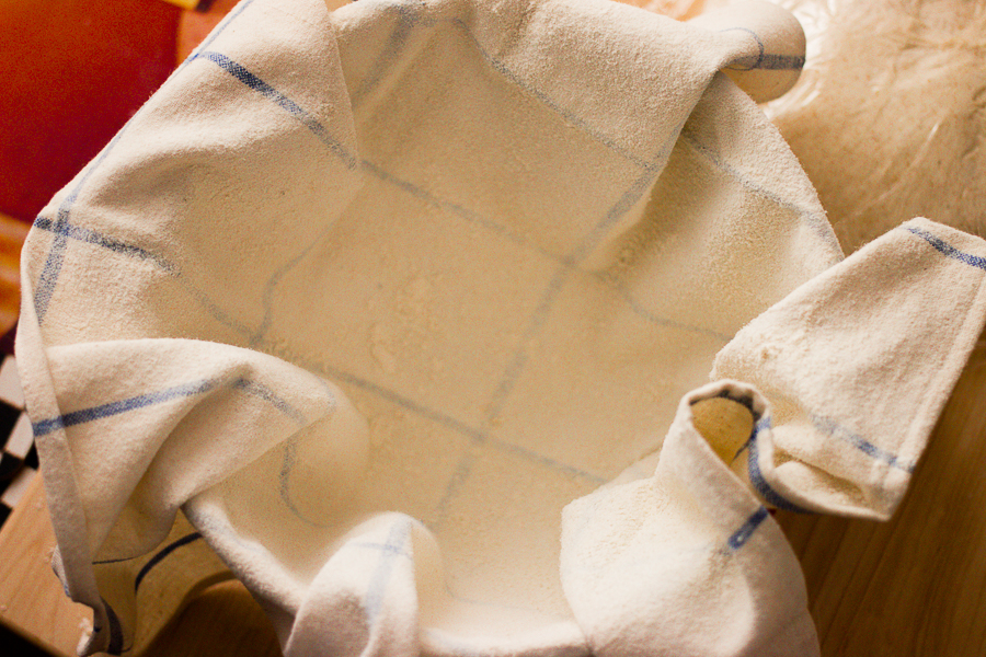 Rub flour thoroughly into a close-weaved dishtowel or napkin. Line the bowl with the towel, and then sprinkle it with more flour.