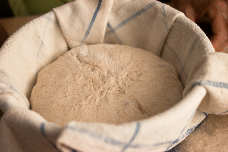 Wrap the bowl or brotform in plastic wrap to prevent the loaf from drying out. When using a bowl, fold the flaps of cloth over the loaf first.