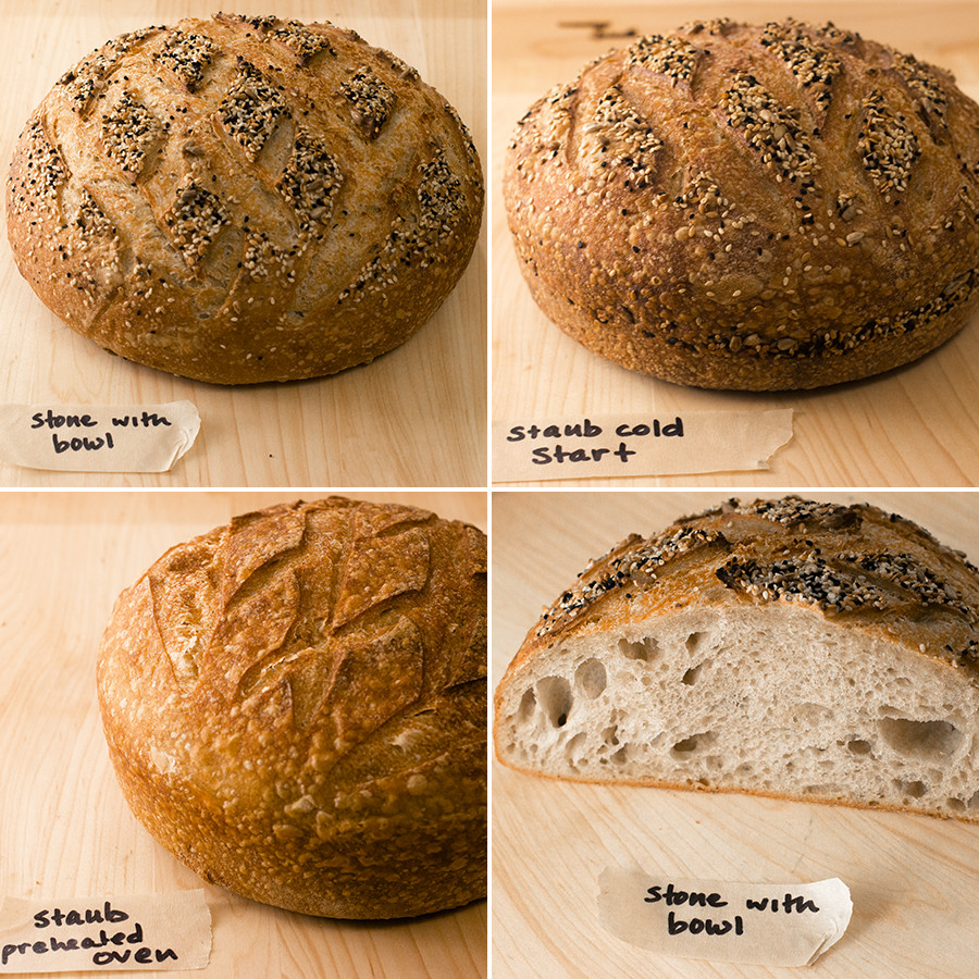 As you can see, all three methods yield lovely, robust loaves. I love the result I get with the stone and bowl, but for ease of use you can’t beat the Staub, and the cold start seems to give very similar results to the preheated oven, so choose whichever technique works best for you and your schedule.