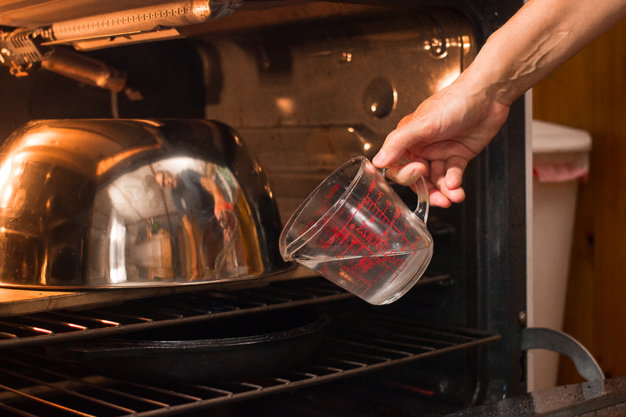 Preheat both the stone and a metal pan below the stone for a full hour at 450°F. Transfer the loaf to the hot stone, using parchment paper or a peel, and place a stainless steel bowl (I use an 8-quart mixing bowl) over the loaf, leaving a portion of the bowl hanging over the stone in front, so that the opening lines up with the pan below. To add steam, pour 1/2 cup boiling water into the hot metal pan below. The resulting steam will rise into the bowl.