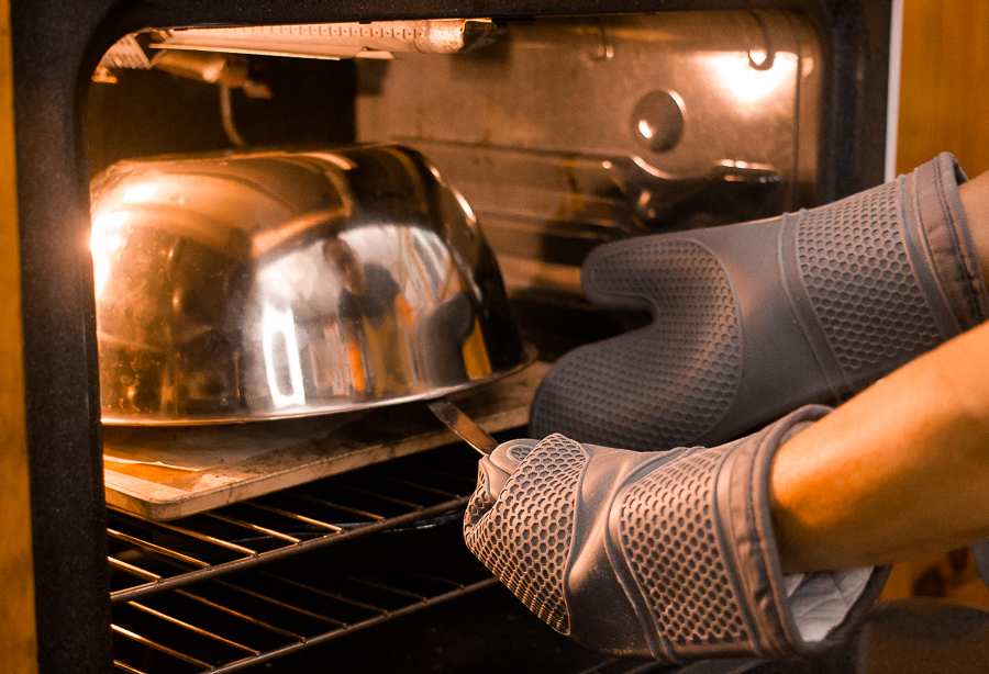 Once the loaf is set, the lid is removed and the loaf can finish baking in a dry oven.