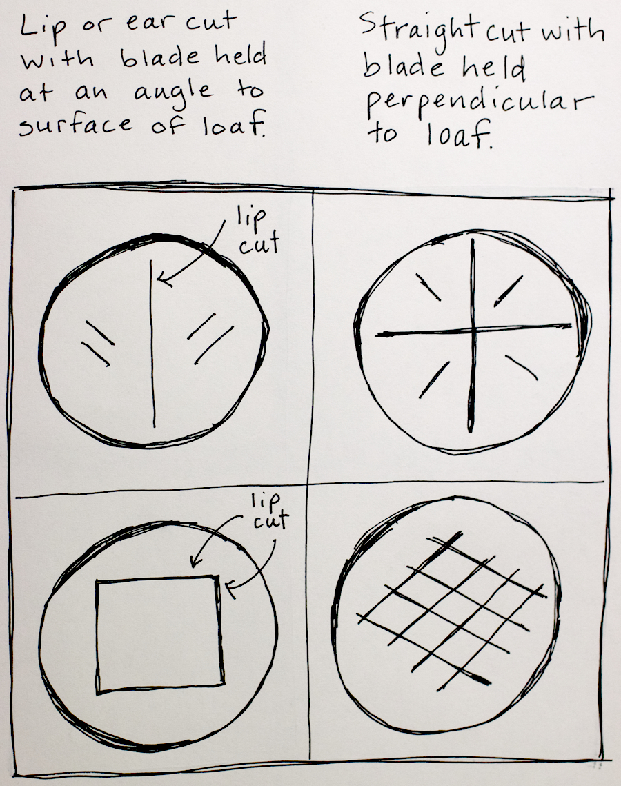 The two on the left require what's called a “lip” or “ear” cut, where the blade is held at a 45° angle to the surface of the loaf. The two on the right require a straight cut, with the blade held perpendicular to the loaf. A lip cut should create a lip or ear of dough that rises above the loaf as the bread rises in the oven; think a well-made baguette.