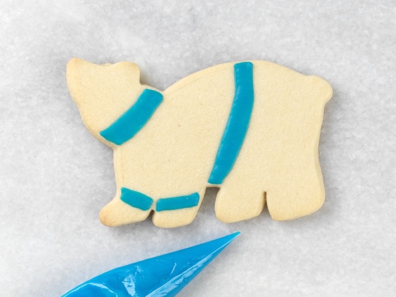 Let dry for a few minutes. This will act as a “dam” for the “flood” of icing you’ll add in the next step. You may pipe a few cookies at a time while the icing sets a bit.