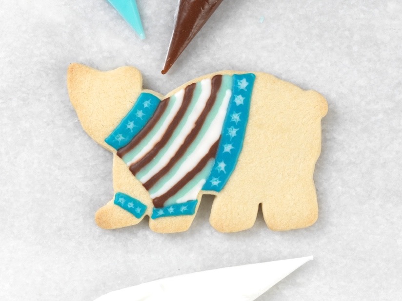 I piped thick lines of white, brown, and blue next to one another to fill the space, but you could also flood the whole area with one color, then pipe lines of the other colors right onto the wet icing.