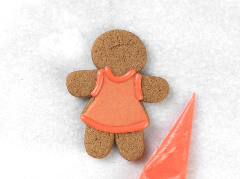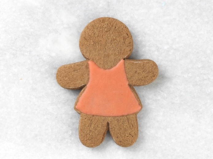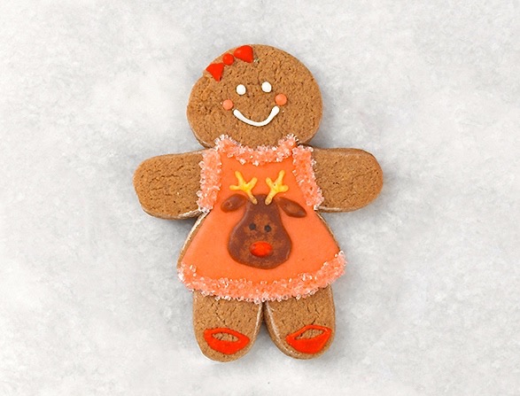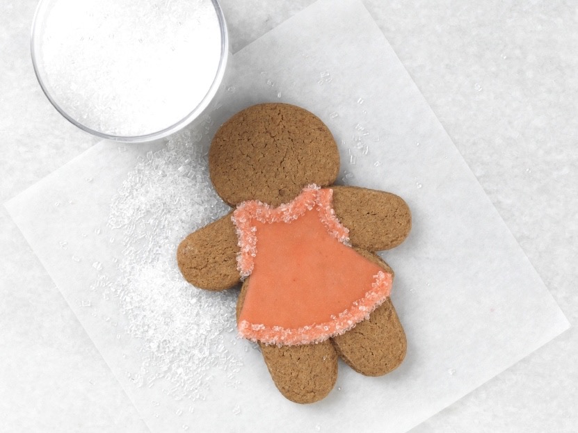 OK, let’s try flocking. This technique allows you to add raised texture to your design using sugars, nonpareils, or sprinkles. We’ll use sparkling sugar on this gingerbread gal to jazz up her festive party dress.