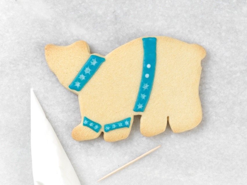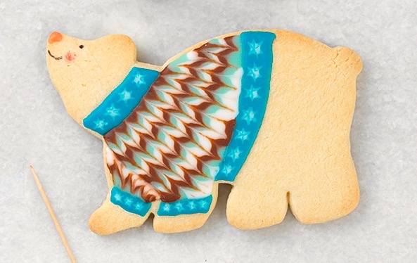 Marbling is a really snazzy technique for adding pattern to your designs. We’ll use it to make a knit-like texture for the polar bear’s sweater, and a snowflake design on the sweater’s bands and cuffs. It’s important to work quickly while the icing is wet, so make sure you have all of your icing and tools ready before you begin.