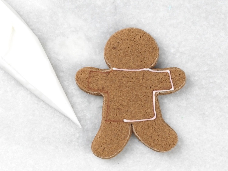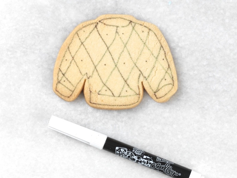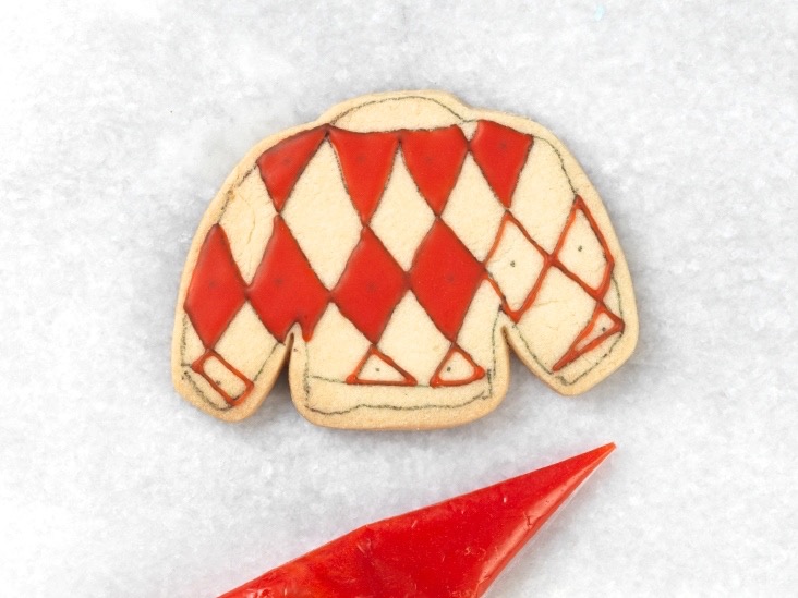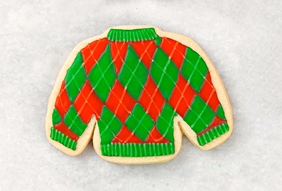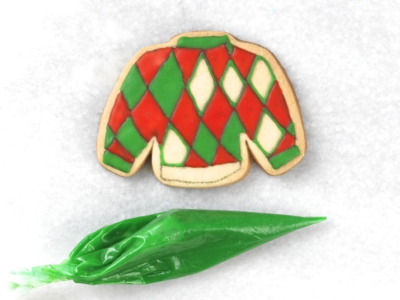 I added lines of coordinating icing to give it an argyle pattern, piping from bottom right to top left; then from bottom left to top right. I also added lines to give a ribbed texture on the neckband and waistband.
