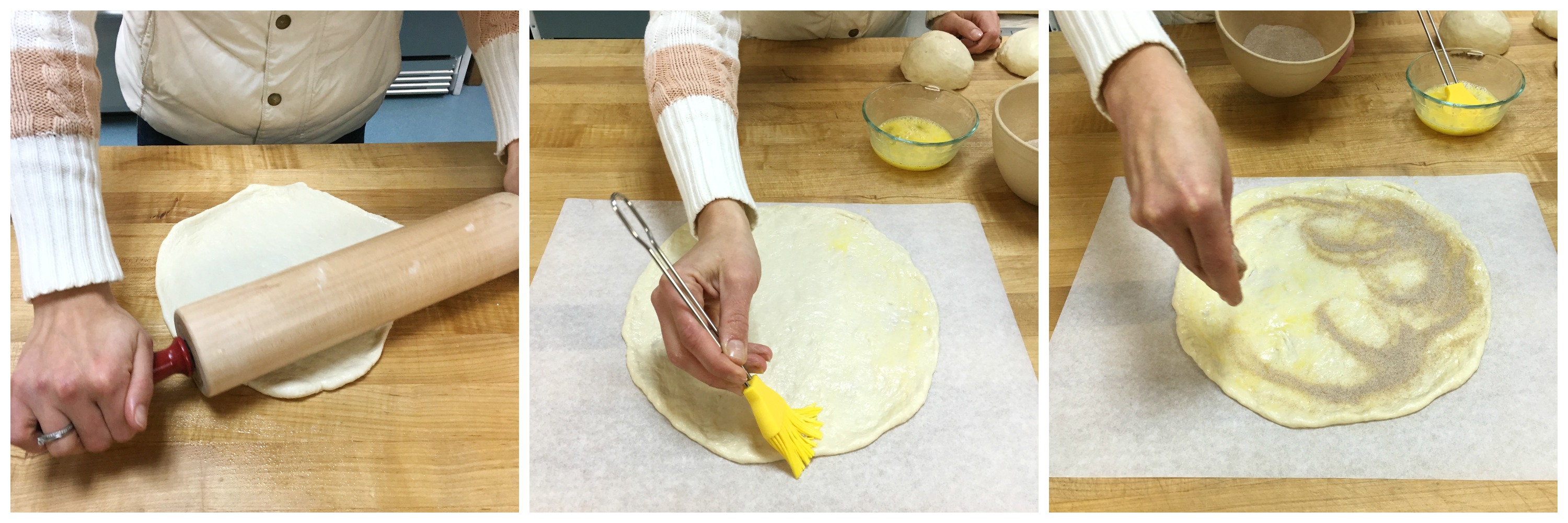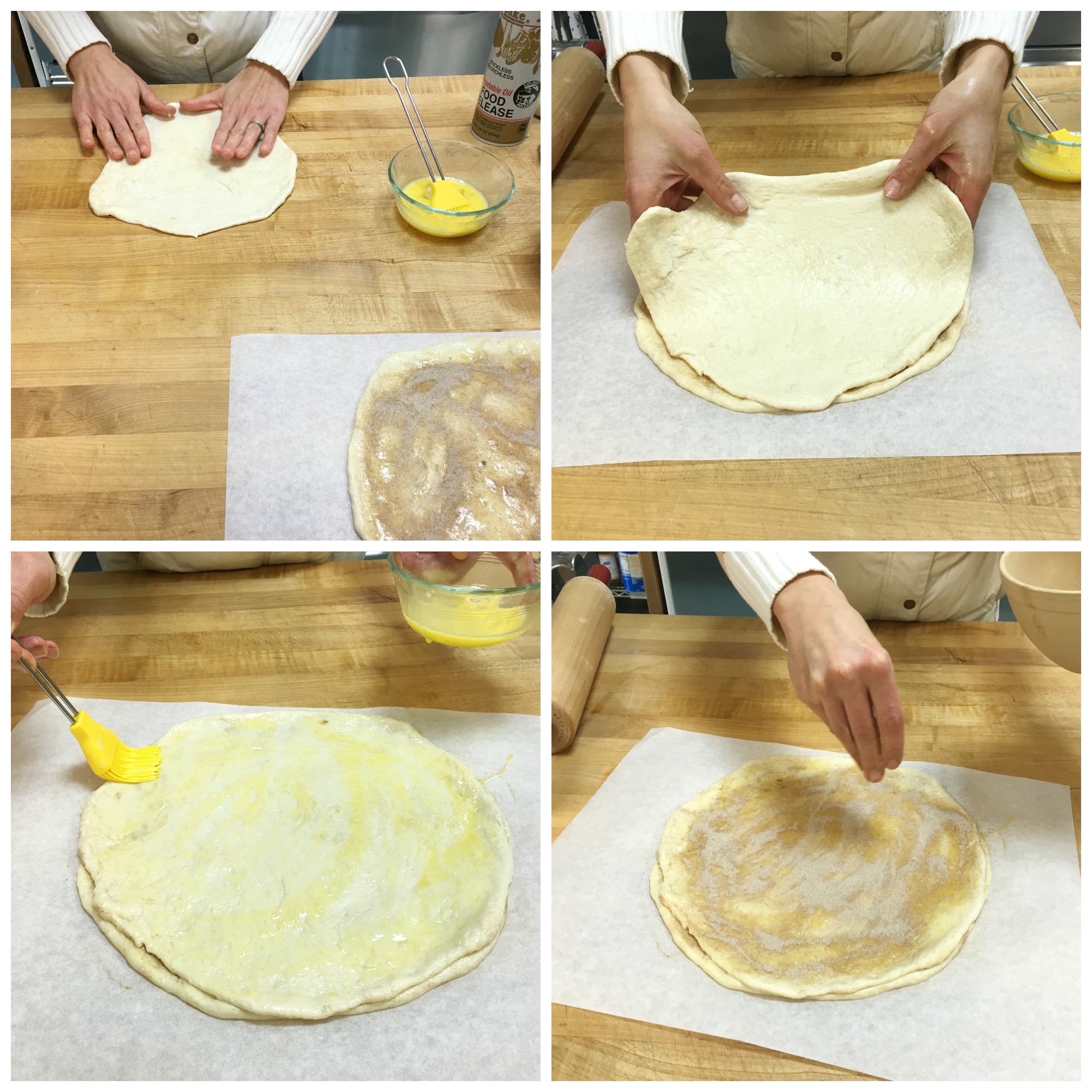On a lightly greased or floured work surface, roll one piece of dough into a 10" circle. Place the circle on a piece of parchment, brush a thin coat of beaten egg on the surface, then evenly sprinkle with 1/3 of the cinnamon-sugar leaving 1/4" of bare dough around the perimeter.