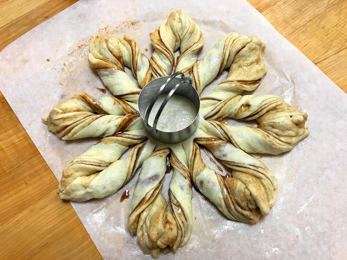 Pick up two adjacent strips and twist them away from each other twice so that the top side is facing up again. Repeat with the remaining strips of dough so that you end up with eight pairs of strips. Pinch the pairs of strips together to create a star-like shape with eight points.