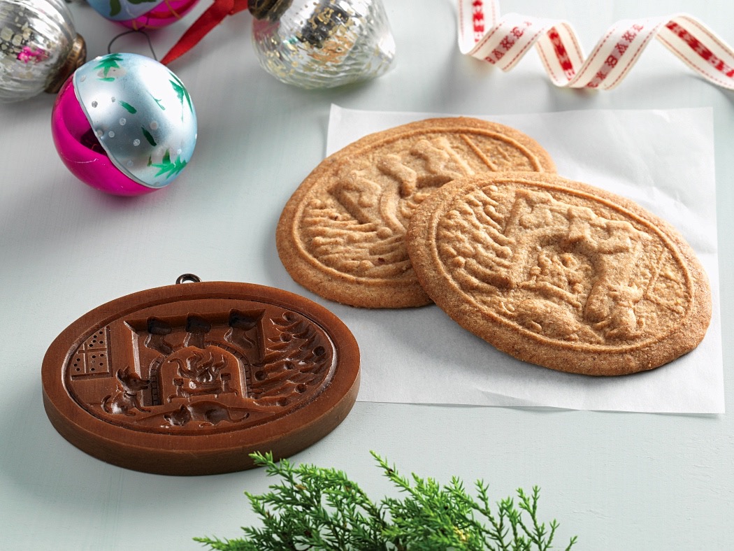 Traditionally leavened with hartshorn (baker’s ammonia) and flavored with anise or lemon, these pretty embossed cookies date back to 14th-century Germany. The intricate molds that shape them are typically carved from wood.