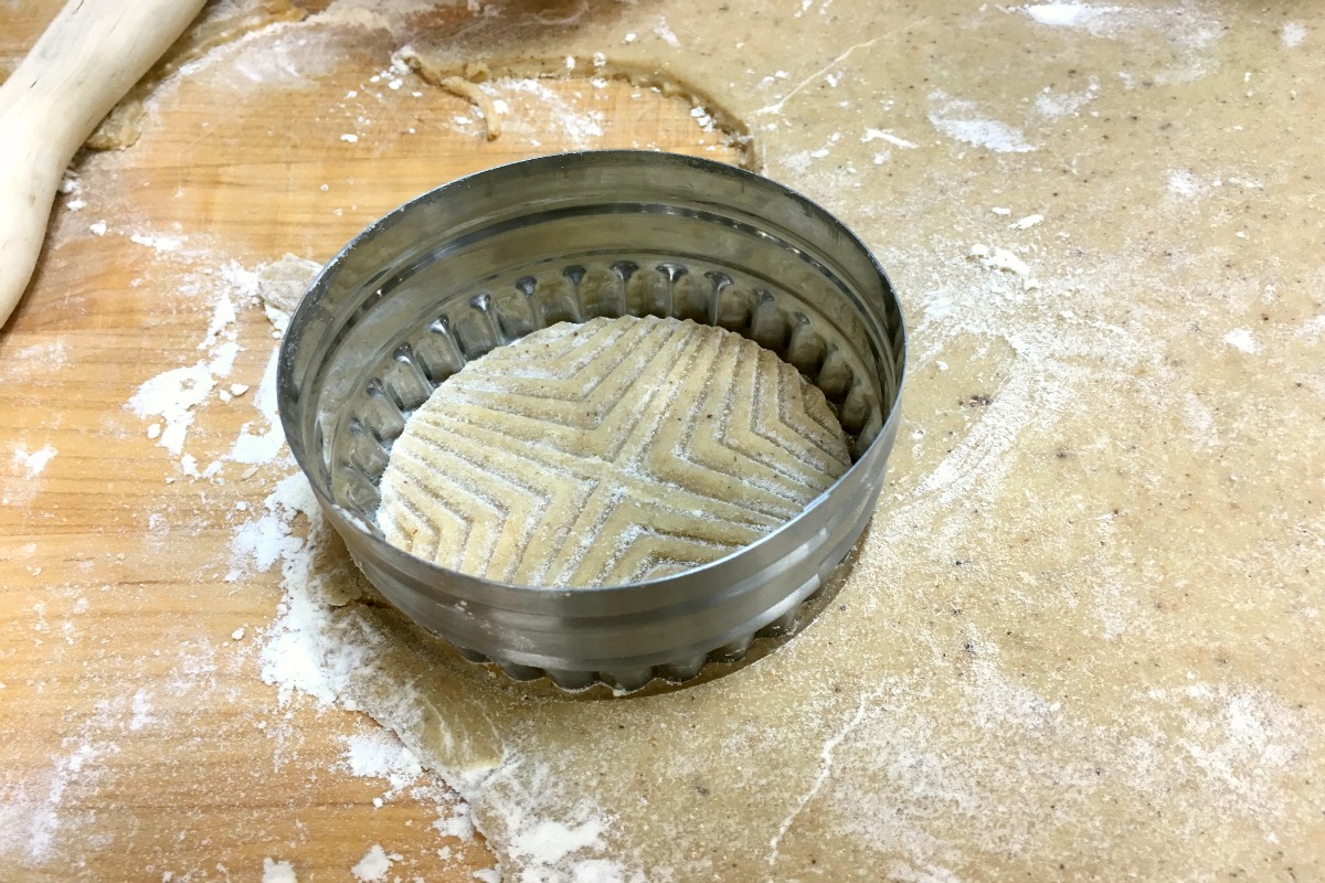 Using a 2 3/4" round cutter, cut out stamped cookies and transfer them to the prepared pans. We love this double-sided round cutter set, because we can choose whether we want the edges of our cookies to be wavy or plain.