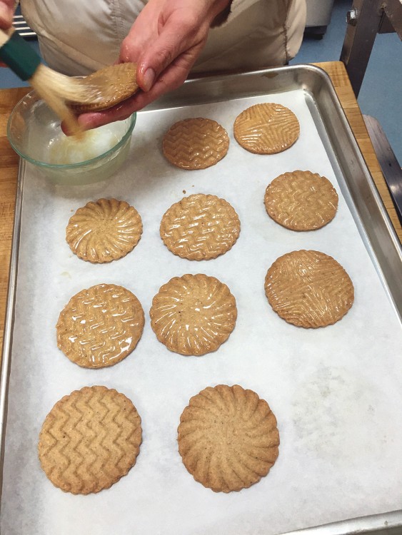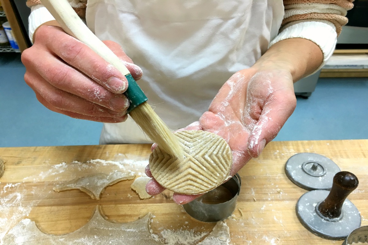 If there's flour pressed into the cookies, gently remove it with a brush. That way, you don't have unpleasant bites of raw flour.