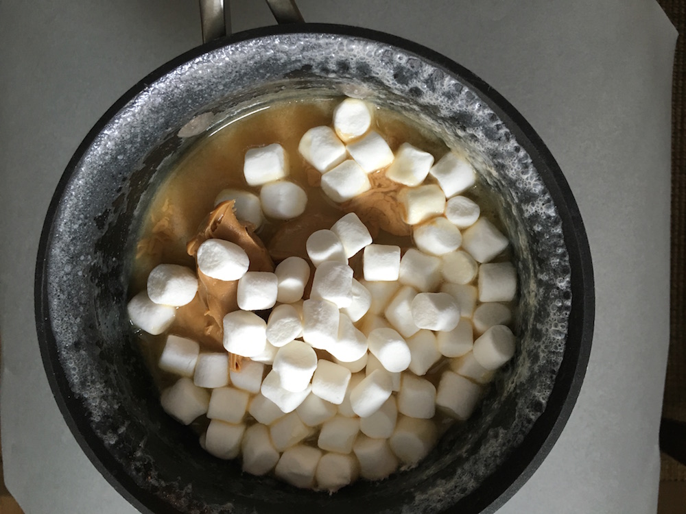 Add all the ingredients, except for the marshmallows, peanut butter, and vanilla, to a saucepan. Bring to a boil, stirring until smooth. Once the mixture is boiling, stop stirring and allow it to come to the soft-ball stage, just as you did in the eggnog recipe.