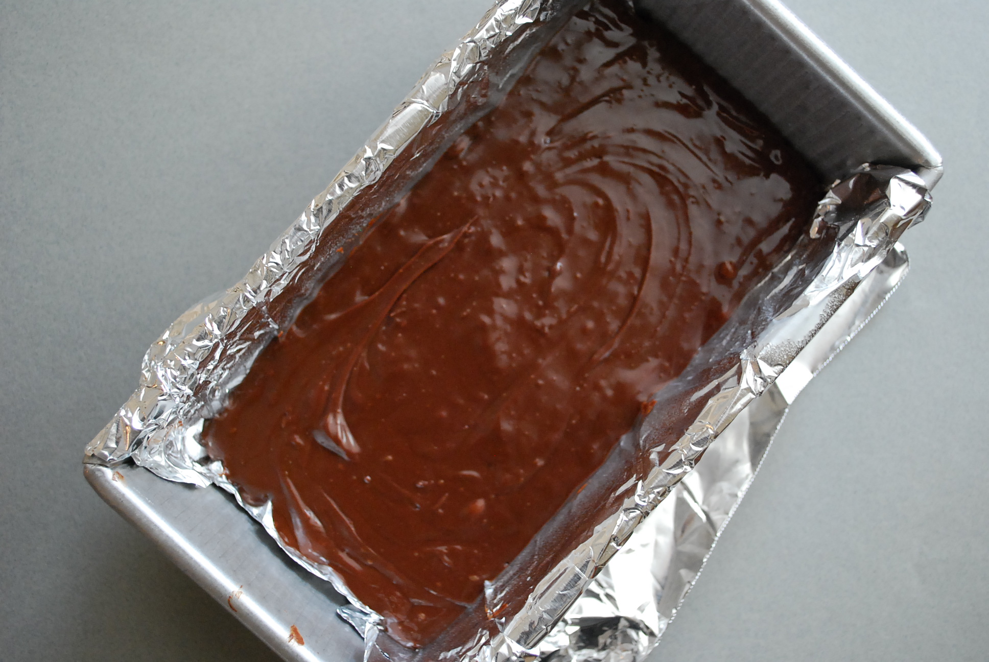 Pour the fudge into a foil- or parchment-lined 9" x 5" loaf pan. You can also butter the pan instead of lining it, but if you're planning on gifting the fudge, lining the pan makes it easier to lift the candy out neatly to slice it.