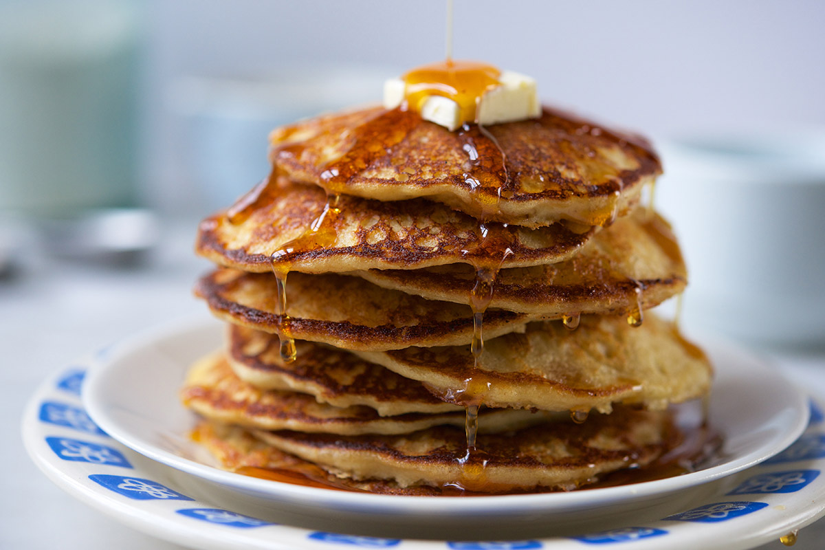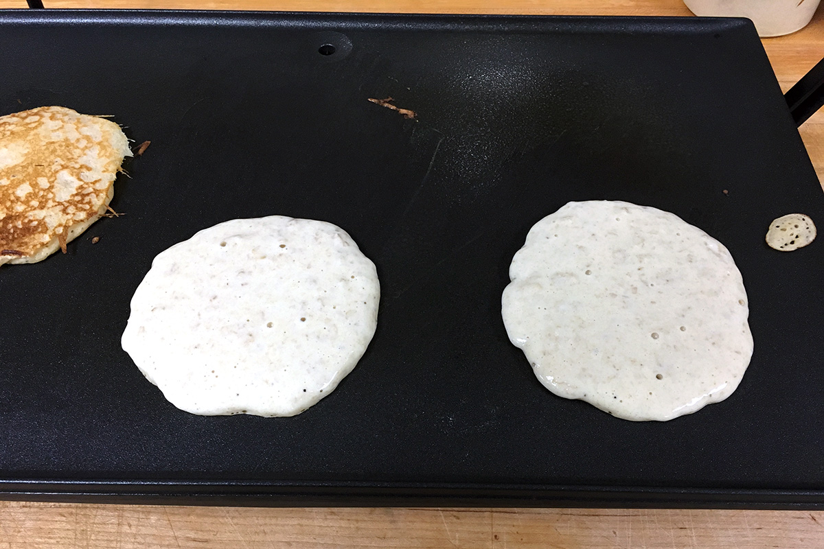 When the edges look dry and bubbles come to the surface without breaking (after about 2 minutes, if your griddle is the correct temperature), turn the pancake over to finish cooking on the second side, which will take about 2 minutes. Serve pancakes immediately, or stack and hold in a warm oven.