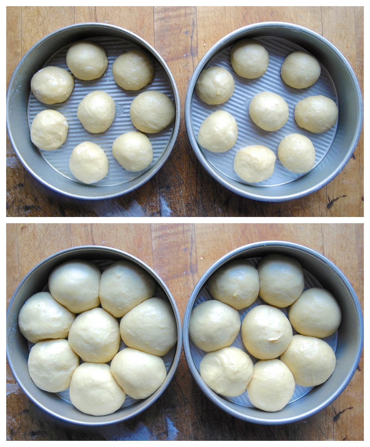 I shape the dough into buns, and let them rise for an hour (bottom).