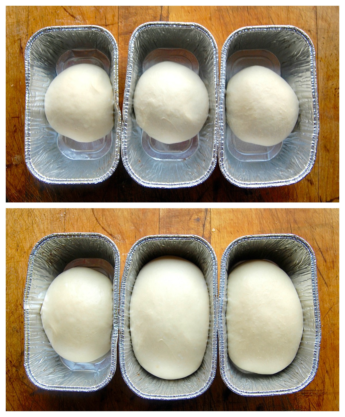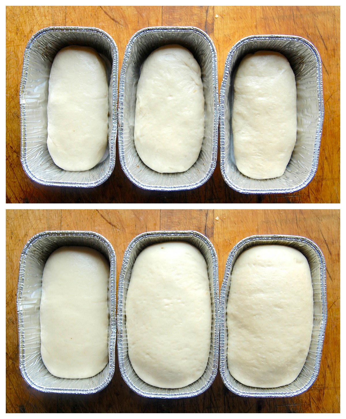 Here they are shaped and in the pan (top); and 1 hour later, risen.