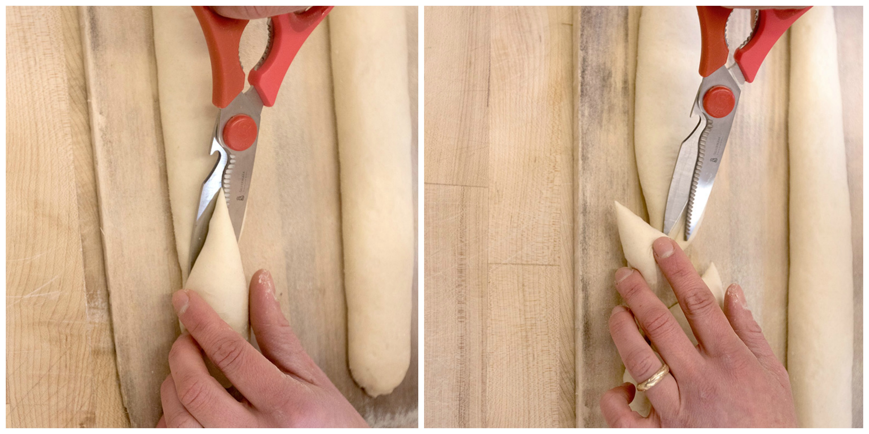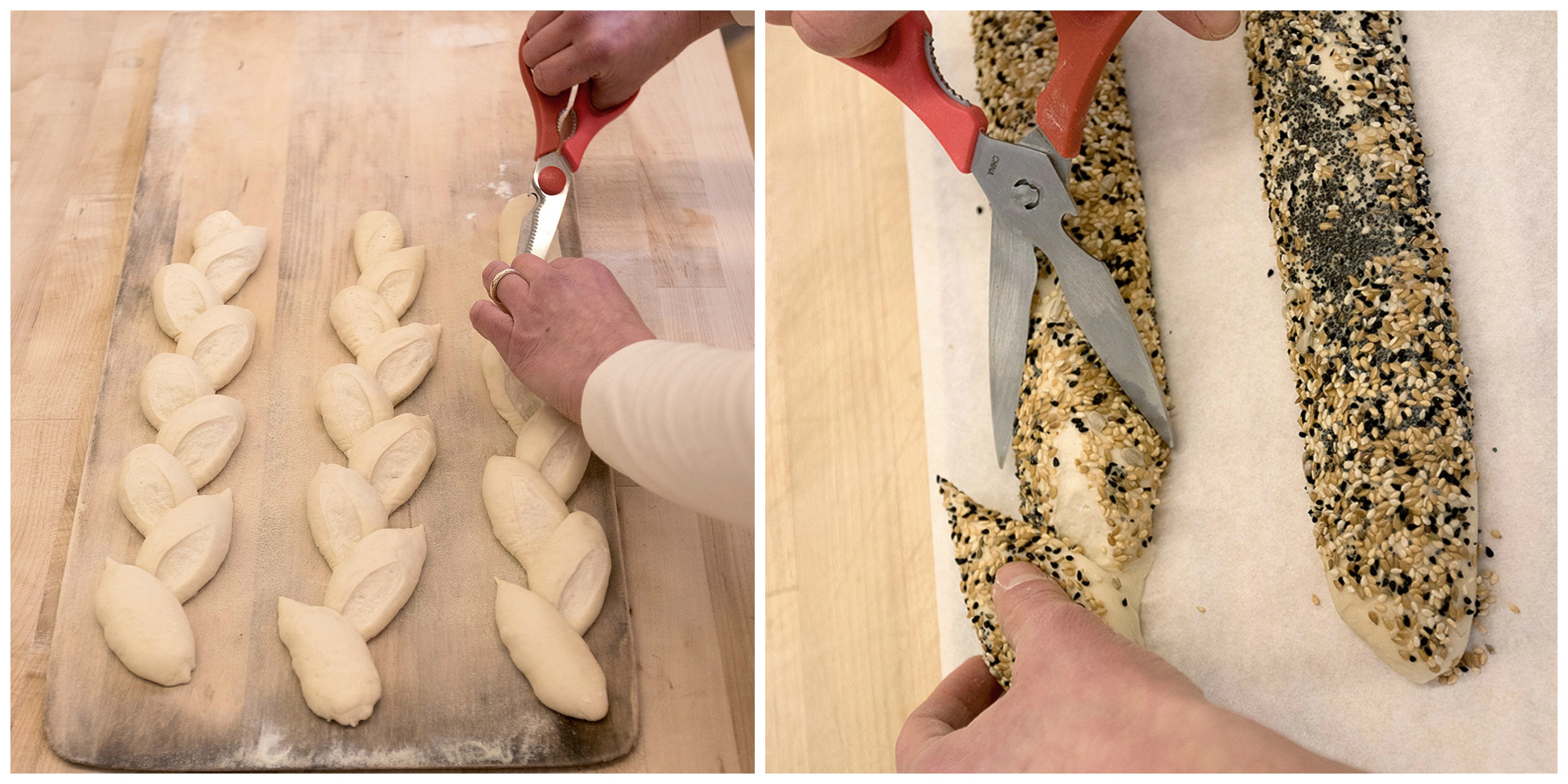 Using scissors held at a 45° angle and held wider than the mouth of the bread, make swift, clean cuts 3/4 of the way into the dough. Move each cut piece to alternate sides of the loaf.