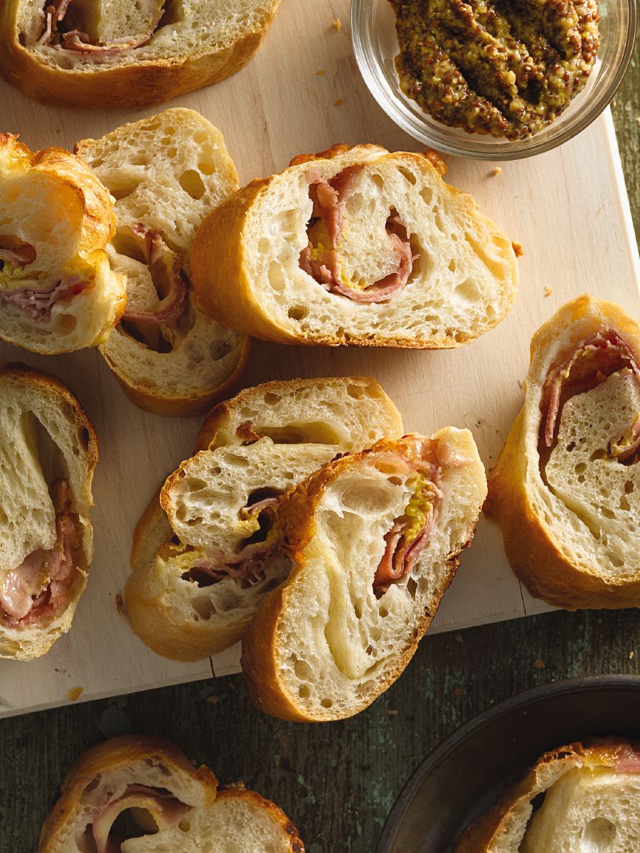 Layer with your favorite filling; we like mustard, ham, and Swiss cheese. Roll up like a jelly roll, sealing the long seam and pinching the ends closed. Place on a parchment-lined baking sheet, and allow to rest for 15-20 minutes, until just slightly puffy. Slash each baguette twice lengthwise before baking.