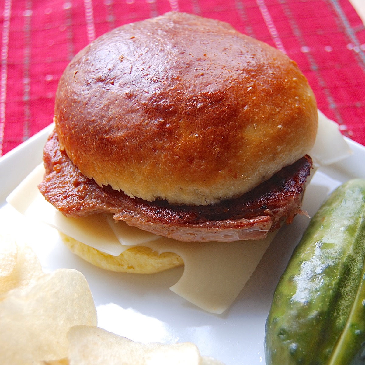 Try filling a bun with ham, mustard, and sliced cheese, then wrapping it in foil, and heating in a toaster oven for 10 minutes or so. The bun softens, the ham warms, the cheese melts, and all in all you're in for one sigh-inducing sandwich.
