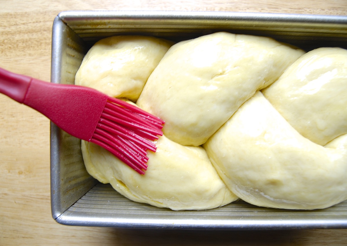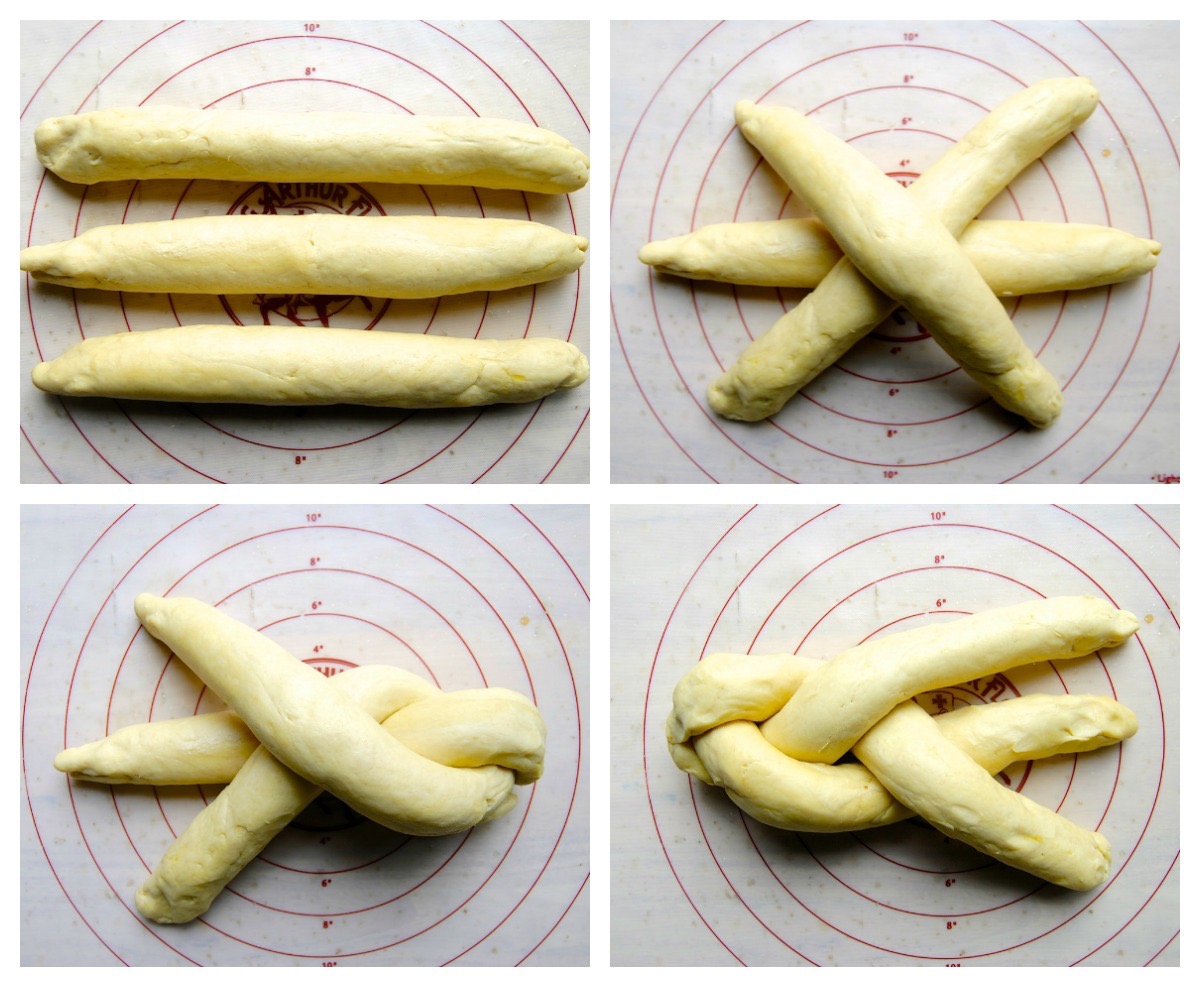 Divide the dough into three pieces, and shape each piece into a 12" log. Braid the logs.