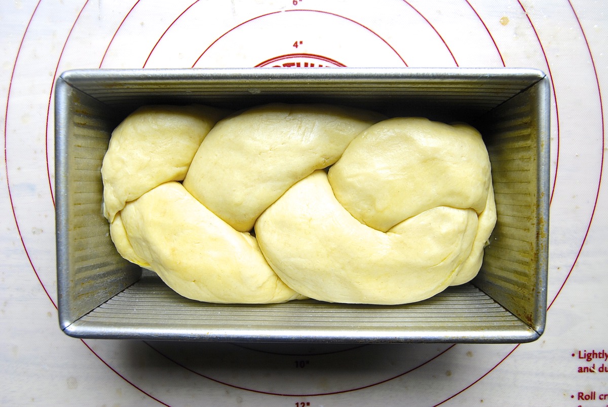 Place the braid in a lightly greased 8 1/2" x 4 1/2" loaf pan. Let it rise, covered, until it's just about even with the top of the pan. Again, this may take up to 3 to 4 hours, depending on how warm your rising environment, and how cold the dough.