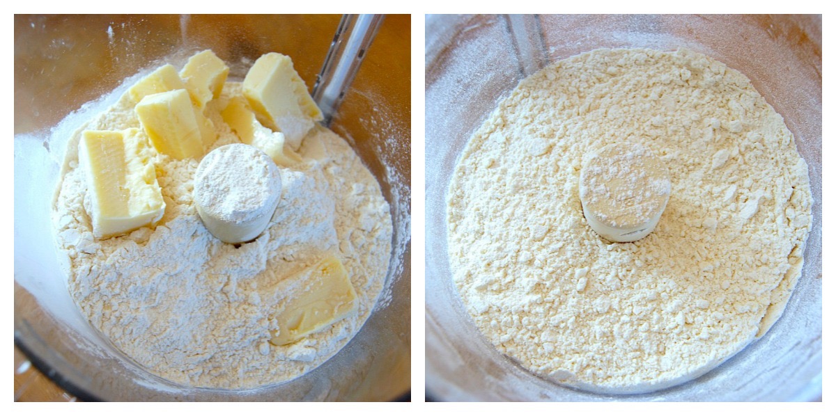 So, put 2 3/4 cups (326g) King Arthur Unbleached All-Purpose Flour and 6 ounces (170g) sharp cheddar cheese, cut into chunks, in the work bowl of your food processor. Process until quite smooth, with no significant chunks remaining.
