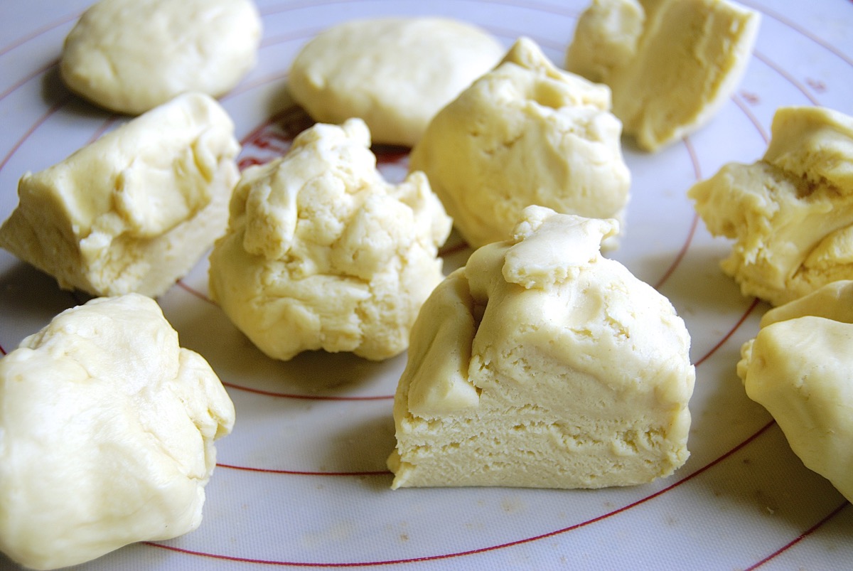 Divide the larger piece of dough into eight pieces simply by dividing in half; then in half again, then in half again.