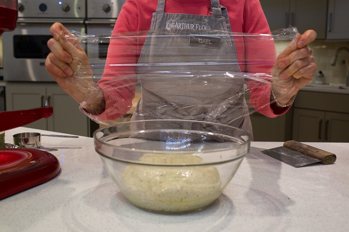 Gently deflate/de-gas the dough by pressing lightly; no need to punch it, says Gael. Turn it out onto a lightly floured counter; it should feel like a big marshmallow, very pliable.