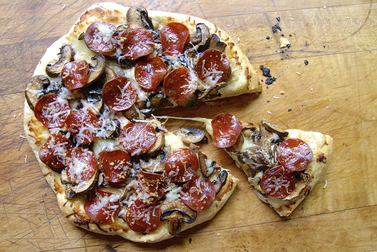 So I tried another version: turkey pepperoni, sautéed mushrooms, and shredded Italian-blend cheese.