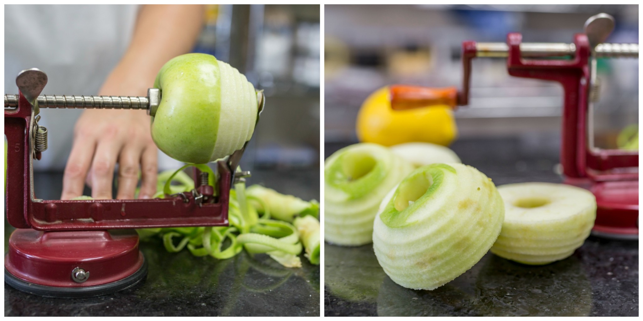 Wash, peel, and core 4 small apples, saving the peels. I find myself using an Apple Peeler, Corer, and Slicer anytime I bake with apples because it just makes it so fast and tidy. Note: if you use a peeler/corer/slicer, remember to move the slicer out of the way; you don't want these apples sliced.