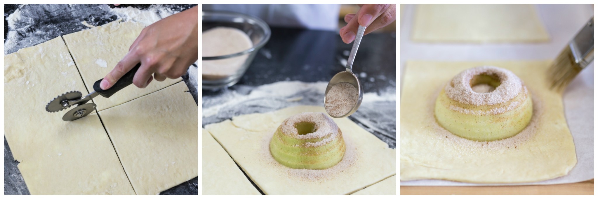 Combine 1/2 cup (99g) sugar, 1 teaspoon cinnamon, and 1/4 teaspoon nutmeg in a small bowl; set aside. Remove half the dough from the freezer and place it on a well-floured surface. Roll it into a 12" x 12" square; it'll be thin.