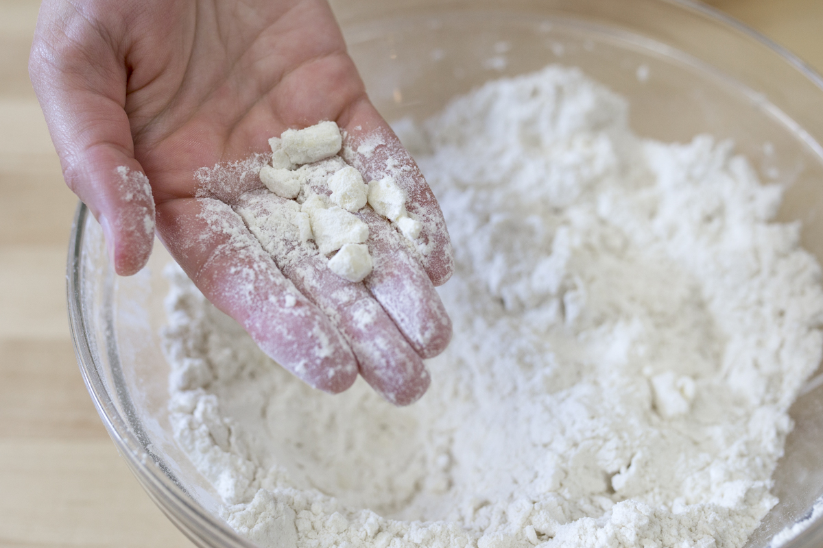 Work in 8 tablespoons (113g) unsalted butter until the mixture is crumbly, using your fingers, a pastry fork or blender, or a mixer, leaving some pea-sized pieces.