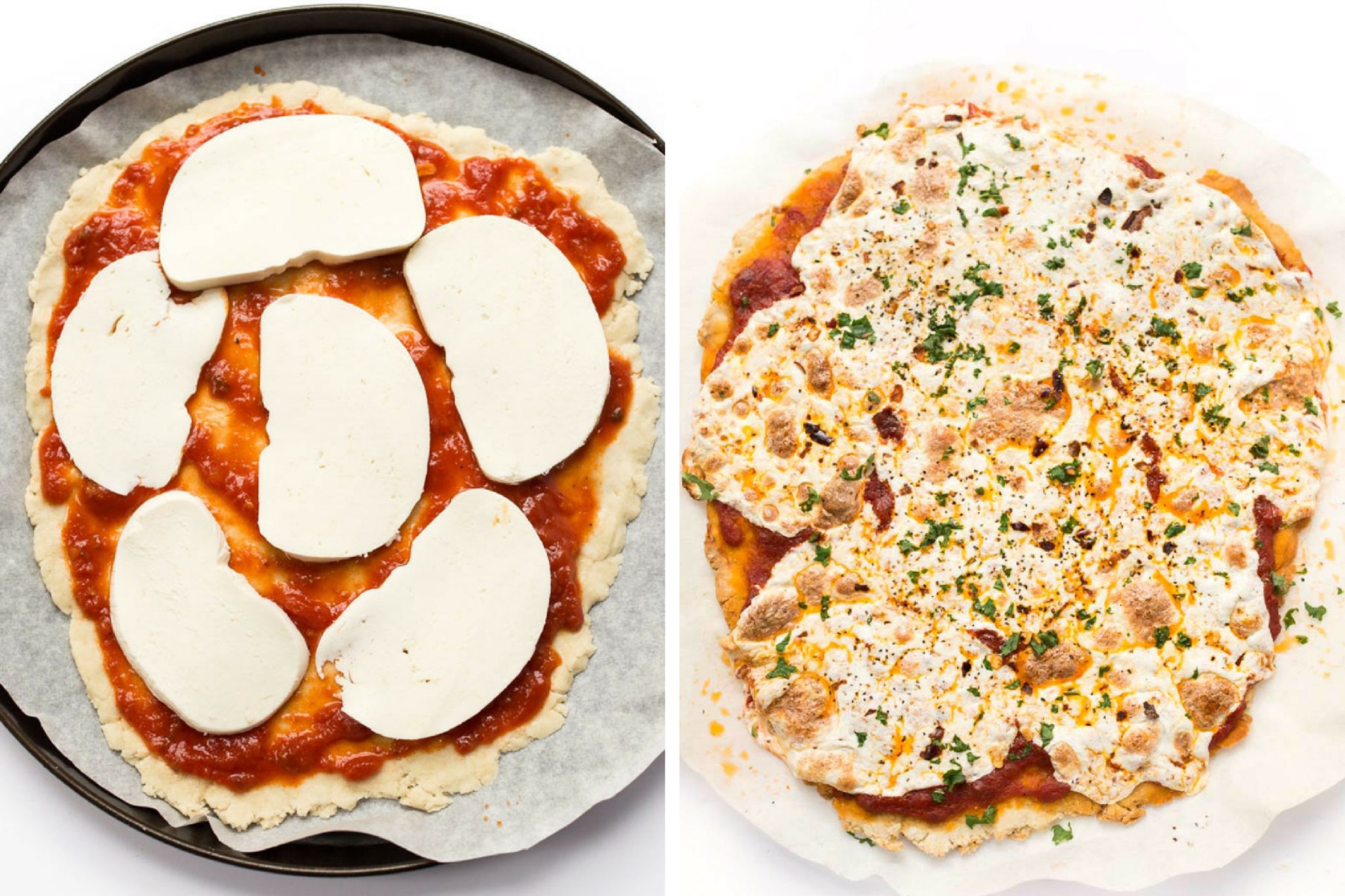 Plus, it has the most incredible texture. We use a blend of baking powder and yeast, which helps make it light, yet it's sturdy enough to hold all your favorite toppings. We're going simple today with tomato sauce and fresh mozzarella, but add whatever your heart desires (just go on the light side since it's thin!).