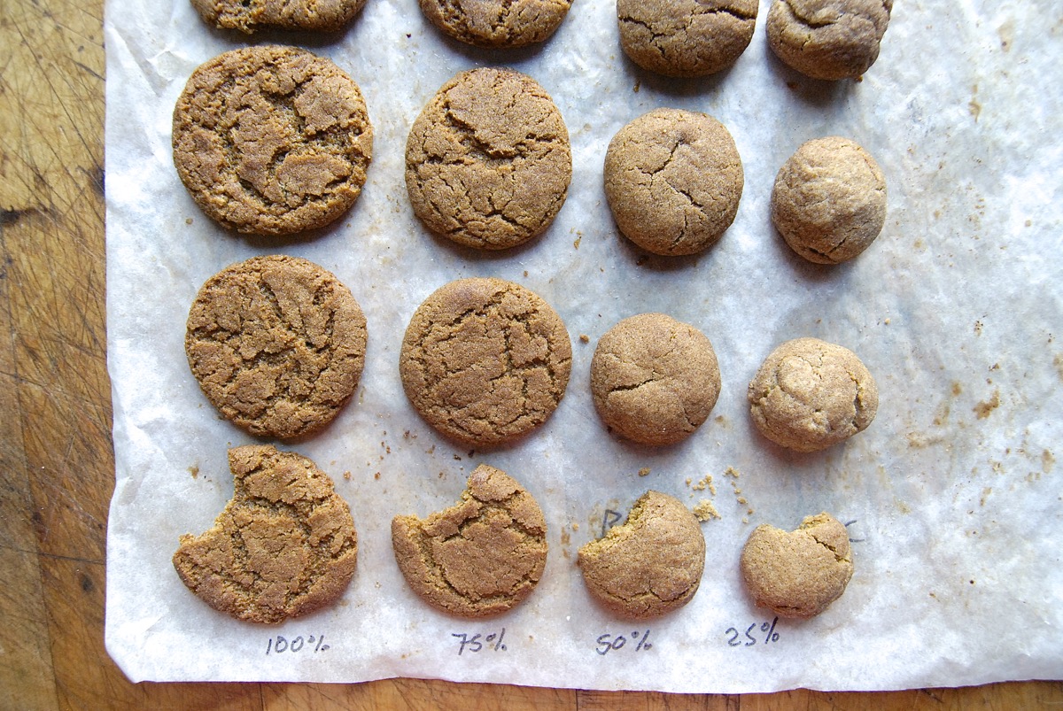 Note: Since the baker's percentage sugar in these cookies is 103%, I tweaked the test a bit. Rather than test 50% of the original recipe and 50% baker's percentage, which would yield almost identical results, I tested versions including 75%, 50%, and 25% of the sugar in the original recipe — no baker's percentages.