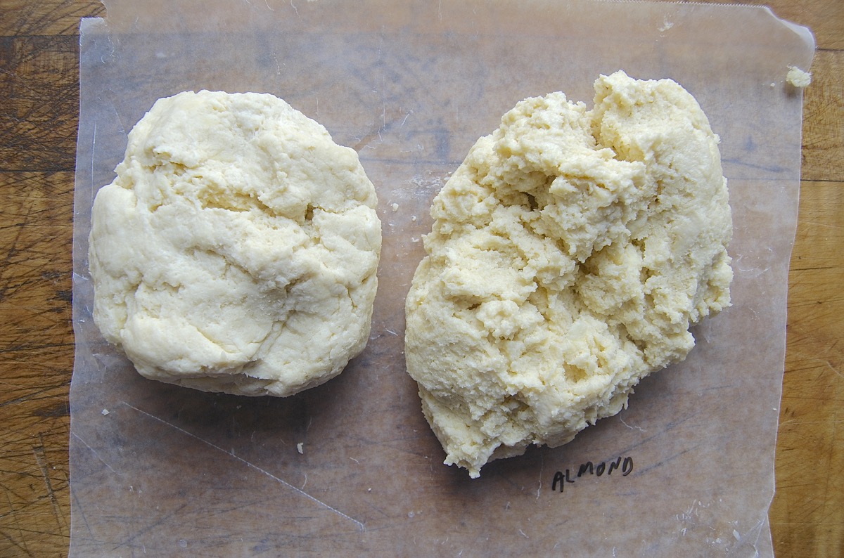 Scone dough made with 25% almond flour (right) is noticeably softer than standard scone dough. While shapeable, it's sticky and very soft.