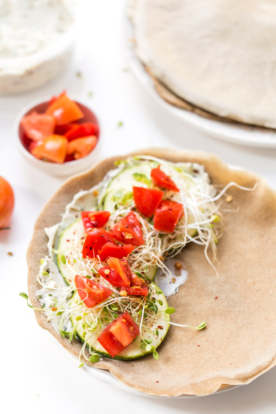We chose to fill ours with a simple spread of chive cream cheese, sliced zucchini, sliced tomatoes, and sprouts. But these can also be served on the sweeter side with something like berries, whipped cream, and maple syrup.
