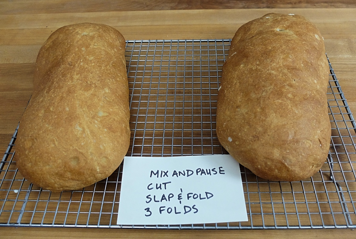 The ciabatta with the most open crumb structure is the hand-kneaded, undimpled loaf (on the right). That's the machine-kneaded dimpled loaf on the left.