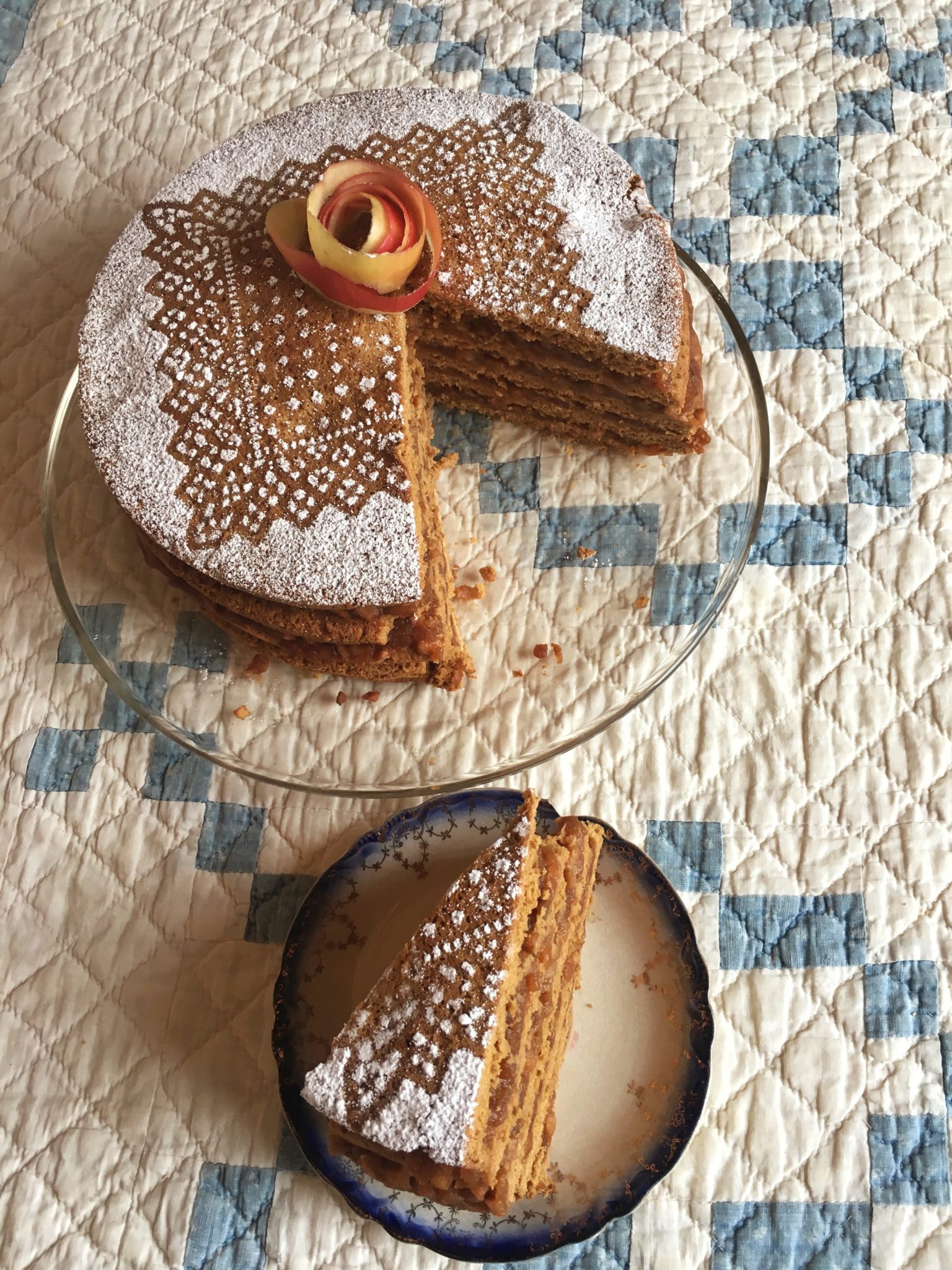 Turn the first lukewarm layer onto a large cake plate. Immediately spread it with 1 heaping cup of the apple filling. Continue baking, stacking, and topping the warm layers. Leave the top layer bare.
