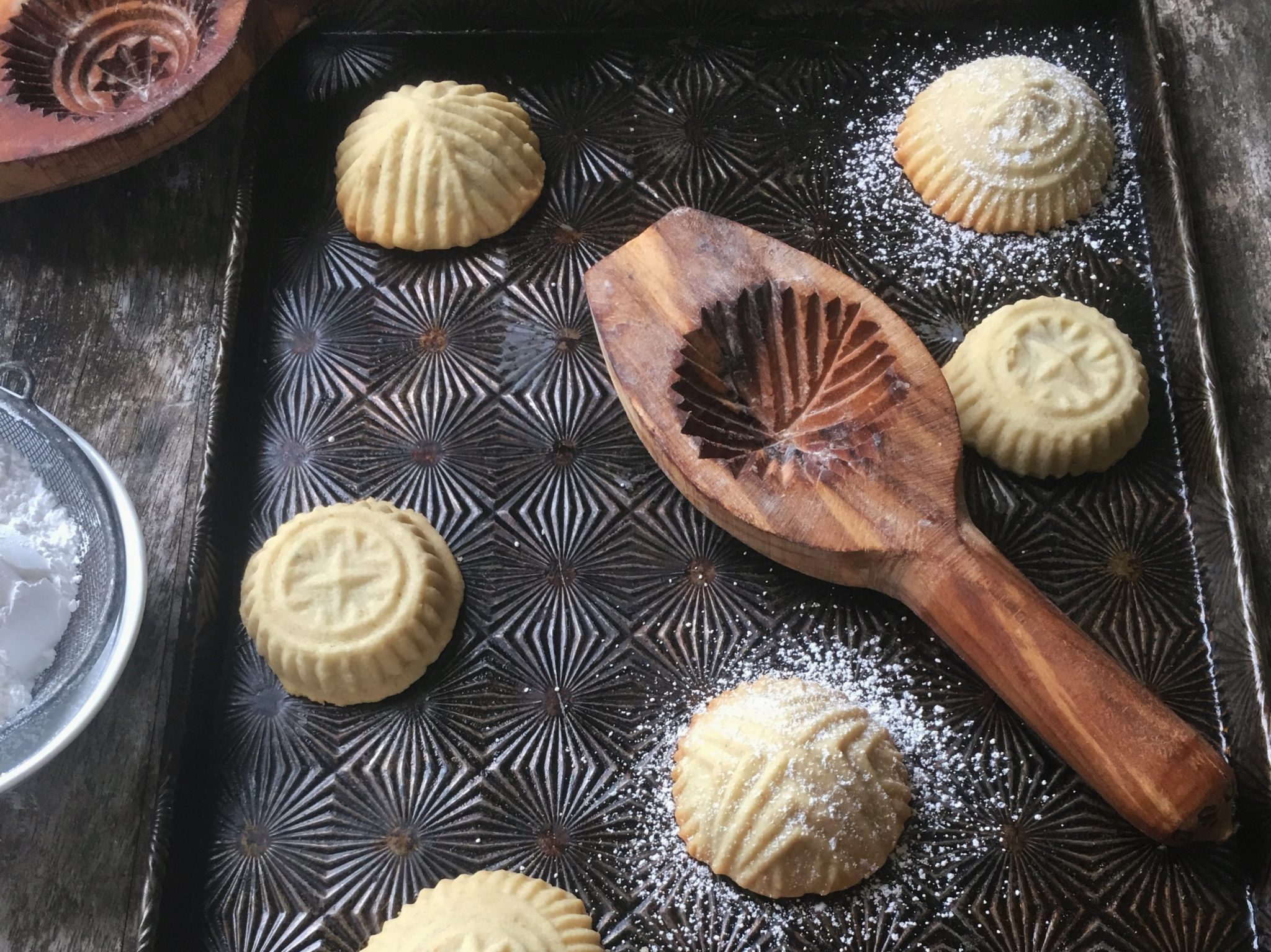 Mahmoul's distinctive shape comes from being filled and pressed into a hand-carved olivewood mold. Once tucked in, the mold is turned over and a quick tap releases the cookie onto a baking sheet.