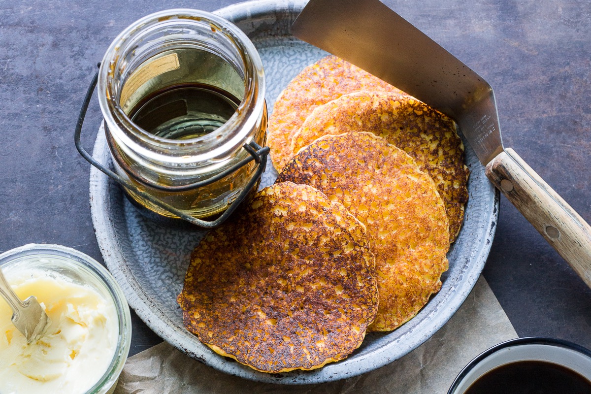 I do have a standard pancake recipe – it makes fluffy cakes with 100% whole wheat flour – but I often swap it out for a special treat: hoecakes.