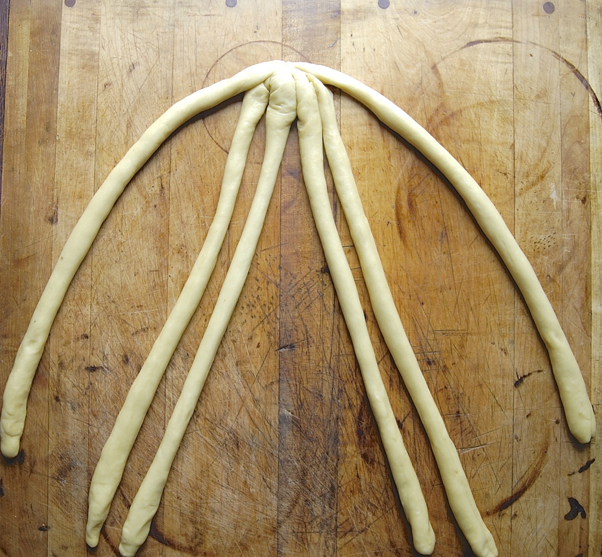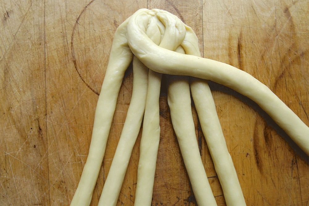 You may braid the challah the traditional way, into a three-strand braid. But for this Bakealong challenge, we'll be tackling a fancier six-strand braid.