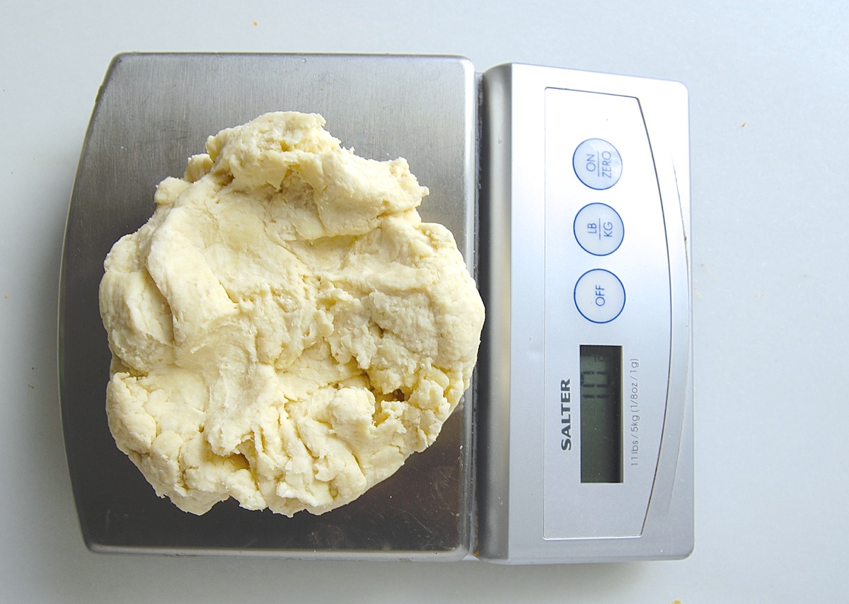 Divide the dough in half; if you're using a scale (and I highly recommend weighing, both for accuracy and ease), each half will weigh about 5 1/8 ounces.