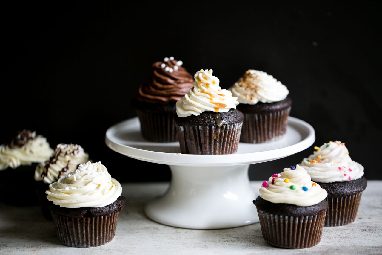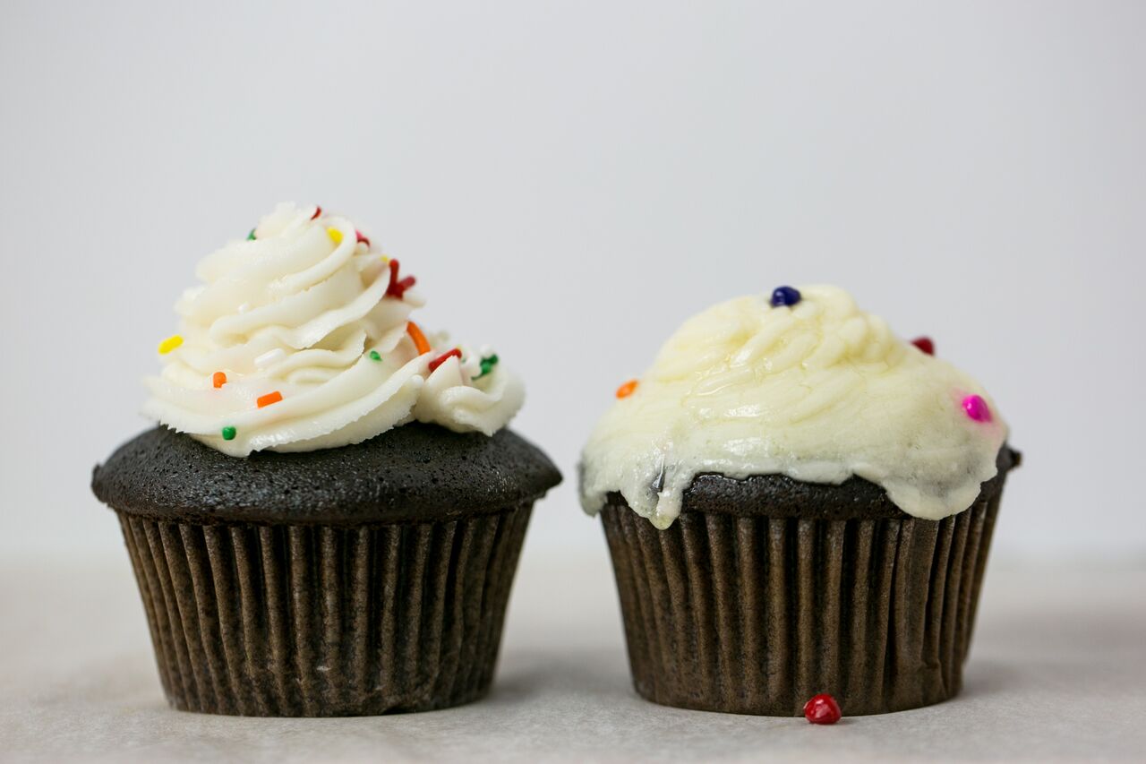 The cupcake on the left is topped with Swiss Buttercream, and the one on the right with Italian.