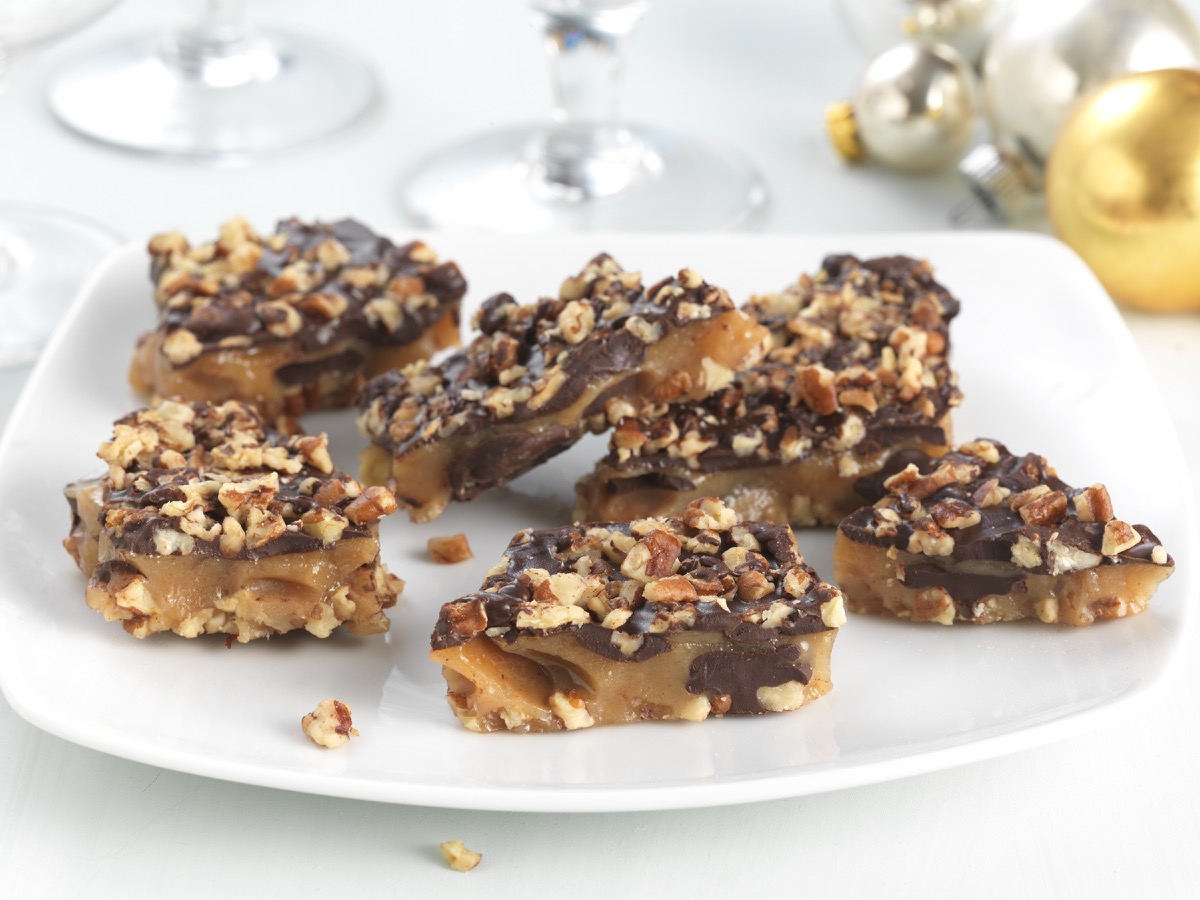 The recipe couldn’t be simpler: Simmer butter, sugar, water, salt, and a touch of corn syrup; then combine the dark-gold syrup with toasted nuts and chocolate chips. Cool, break into pieces, and share with family and friends — all of whom will wax poetic about the joys of buttercrunch!
