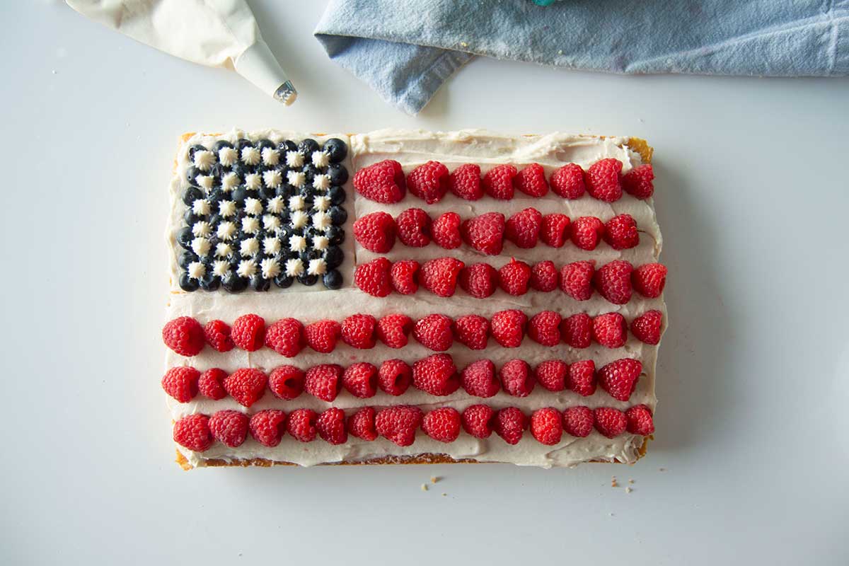 Finally, the decoration itself — fresh, juicy summer berries! While I’ve chosen raspberries and blueberries as my red and blue representatives, you can use any color-coordinated fruit you’d like. Think sliced strawberries, cherries, or anything else that looks good at the market. This cake is the perfect opportunity to showcase the bounty of summer produce.