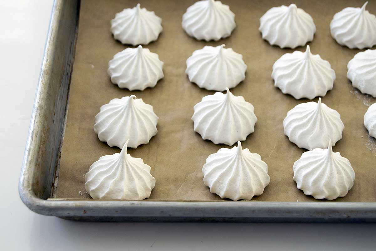 And instead of piping the meringue into individual cookies, you can make vegan Pavlova by spreading it into a single circle, baking to a crisp, and topping with coconut whipped cream and fruit.